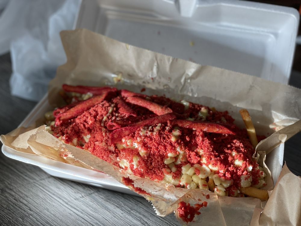 Crispy fries topped with corn kernels, a creamy sauce, and a generous dusting of Hot Cheetos crumbles.