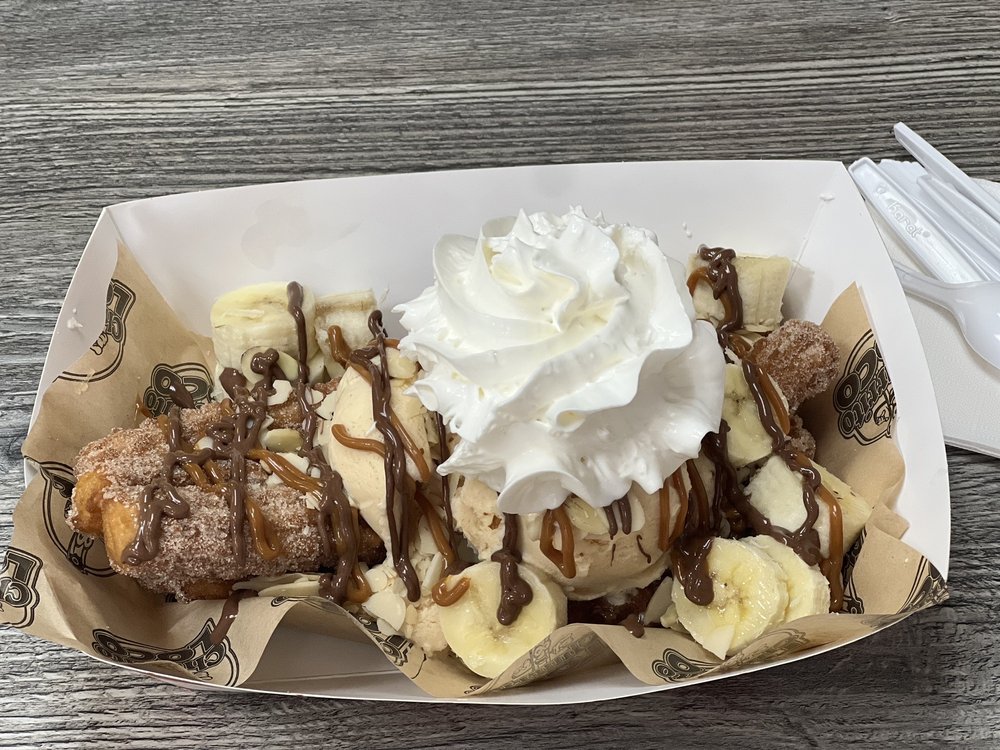 Your choice of ice cream, drizzle, topping. Topped off with whip cream and a churro.